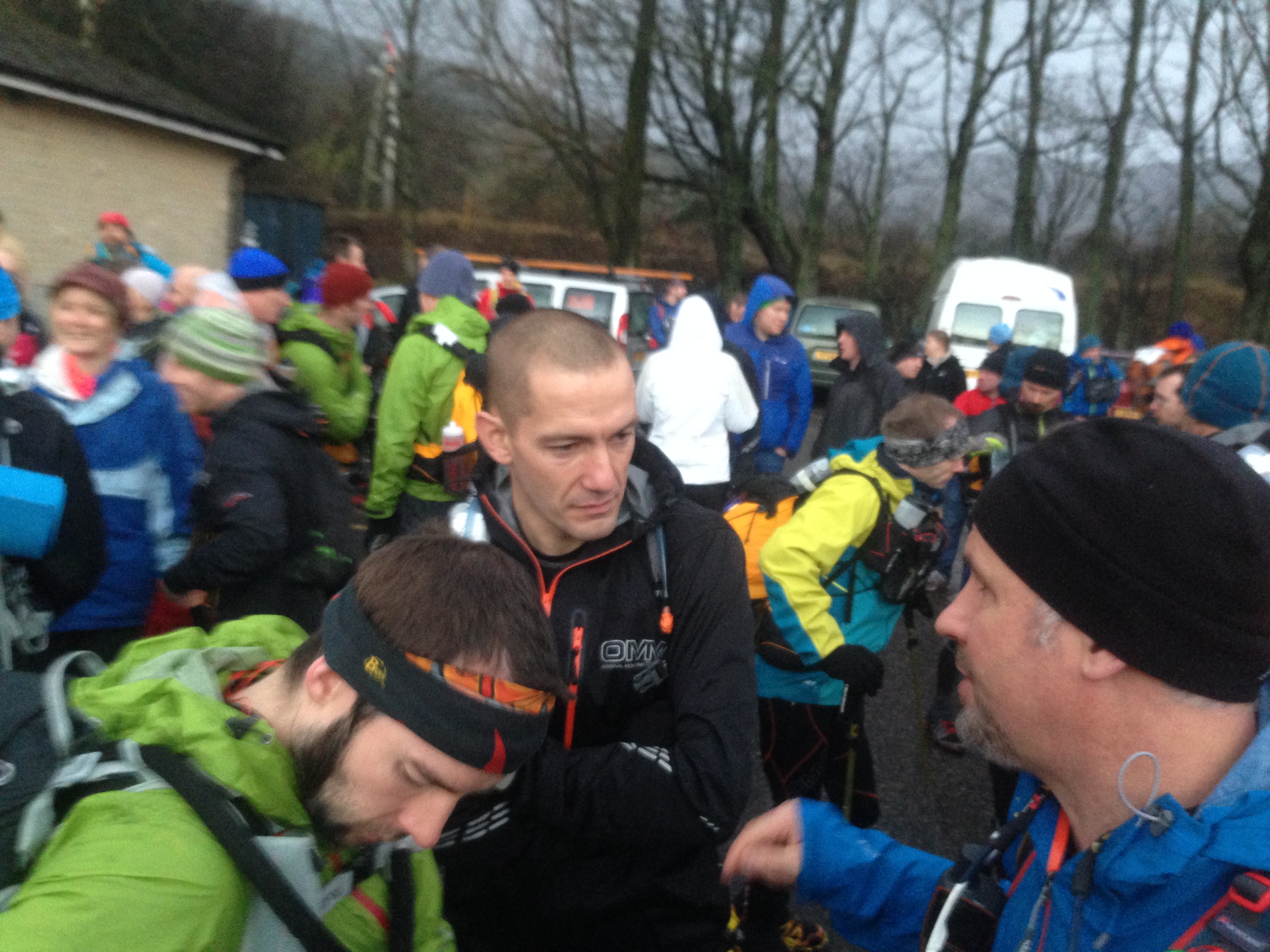 Back down to the village hall for a quick and successful kit check and to get my GPS tracker attached (provided by opentracking, really handy for friends and family), picked up a state of the art cotton spine t-shirt and commenced hanging around in the drizzle waiting for the start.