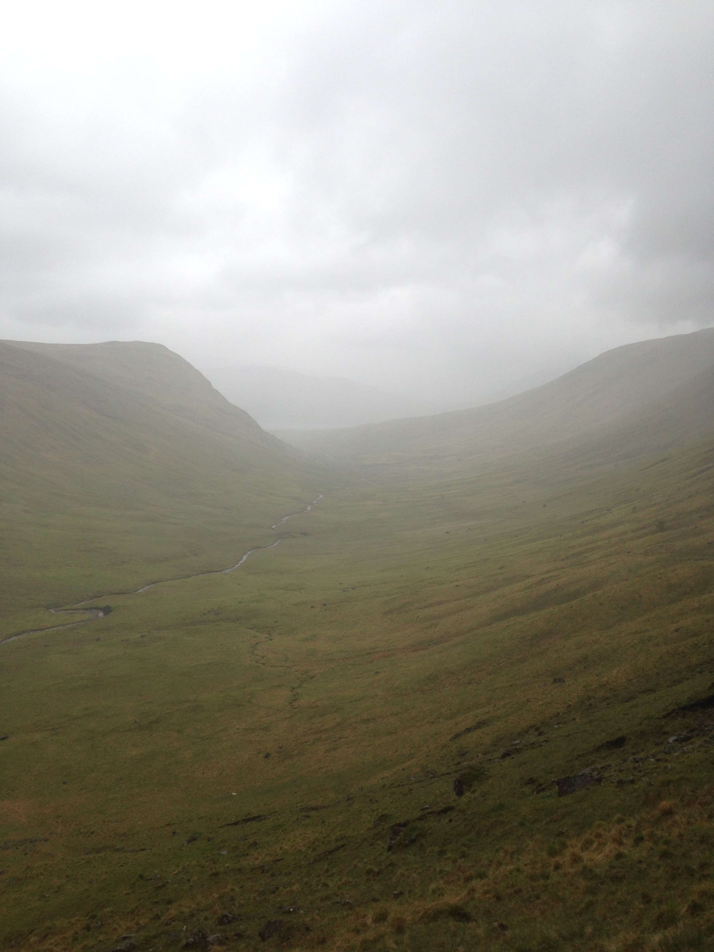 The path is very faint in a lot of places, but it’s pretty clear from the map which way to head, and an uneventful hour of steady climbing delivered us over a ridge and into thick fog, rain and wind.
