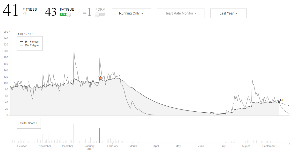 I’ve gone from about as fit as I’ve ever been to not feeling very fit at all over the last 6 months. The fitness/freshness chart below sums it up better than I can: