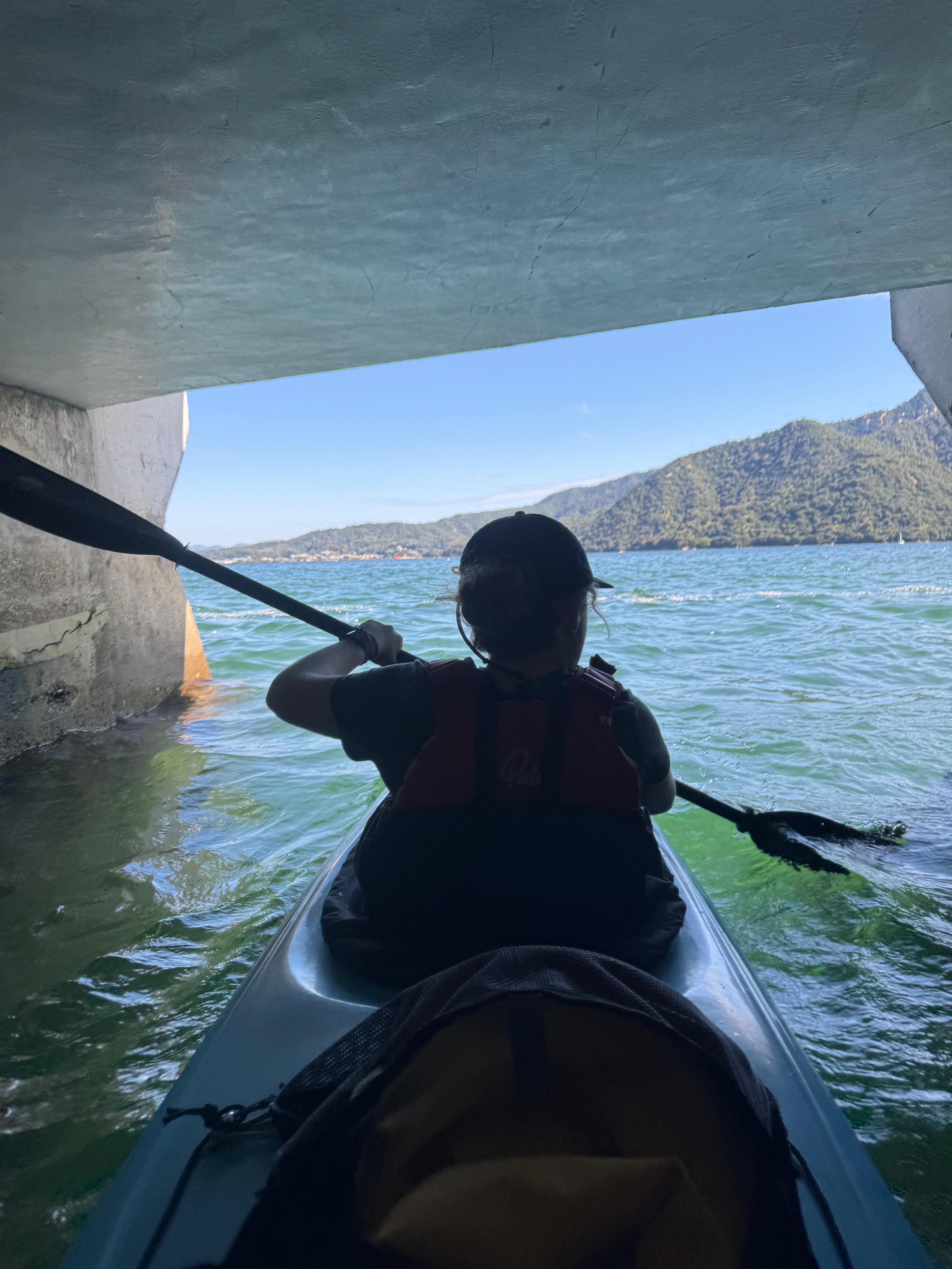 We can see throngs of tourists on the shore, but it’s just us bobbing around out here, taking a few moments to rest our arms and admire the view.