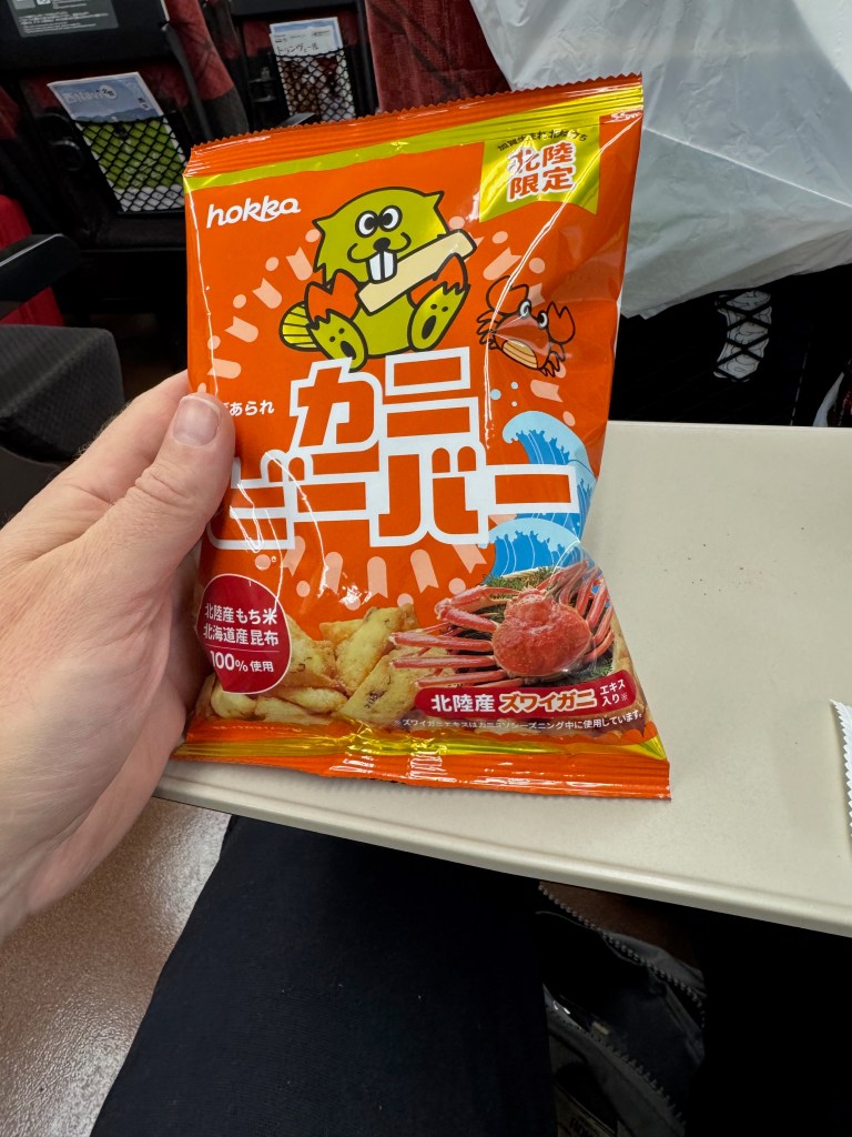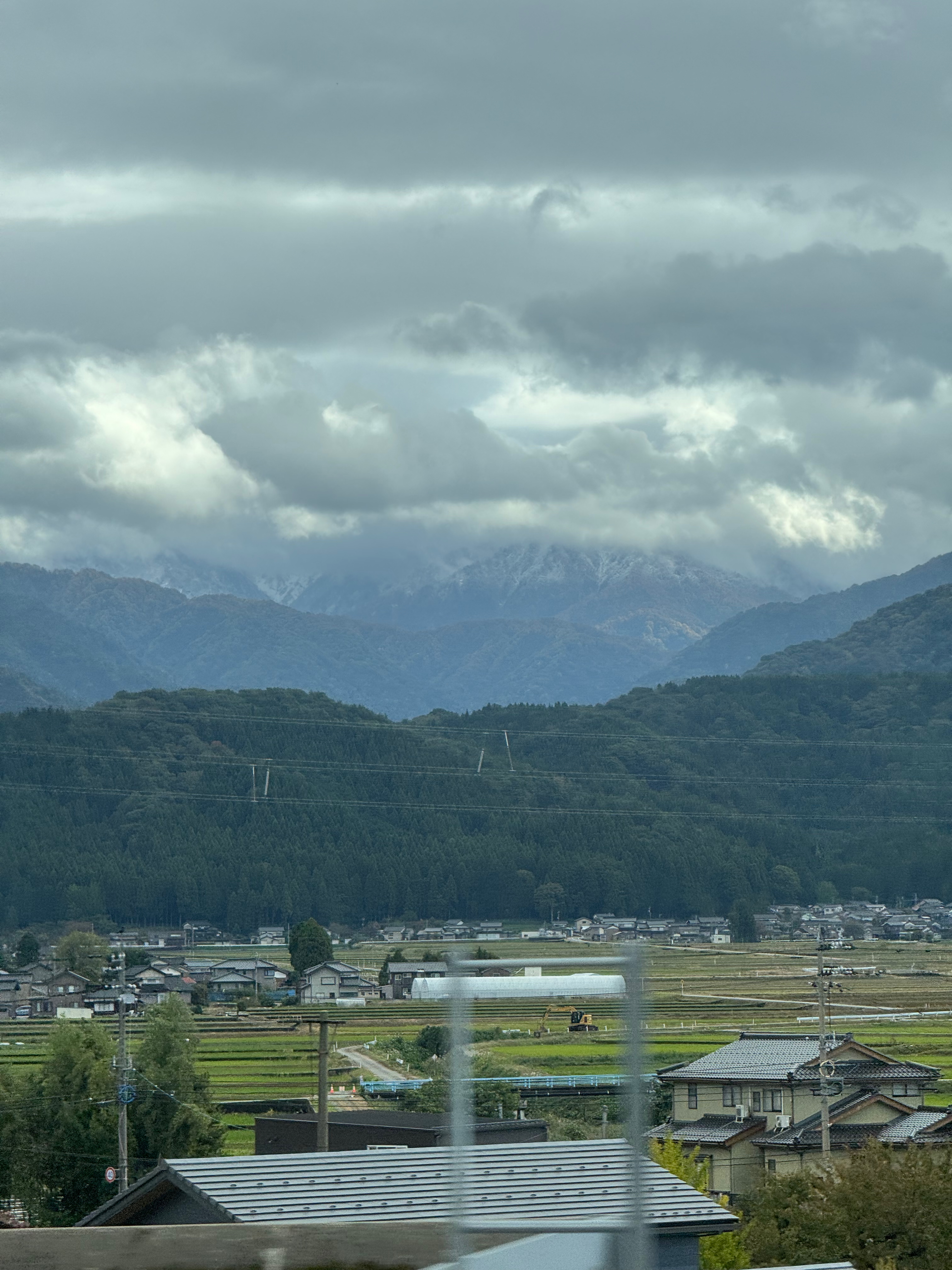 I knew we’d be travelling through the Japanese alps today, but didn’t think we’d actually get to see any of them. Passing through Itoigawa we could see distant snowy peaks on one side, and a choppy misty sea on the other, like Craighouse on the Isle of Jura, but more.