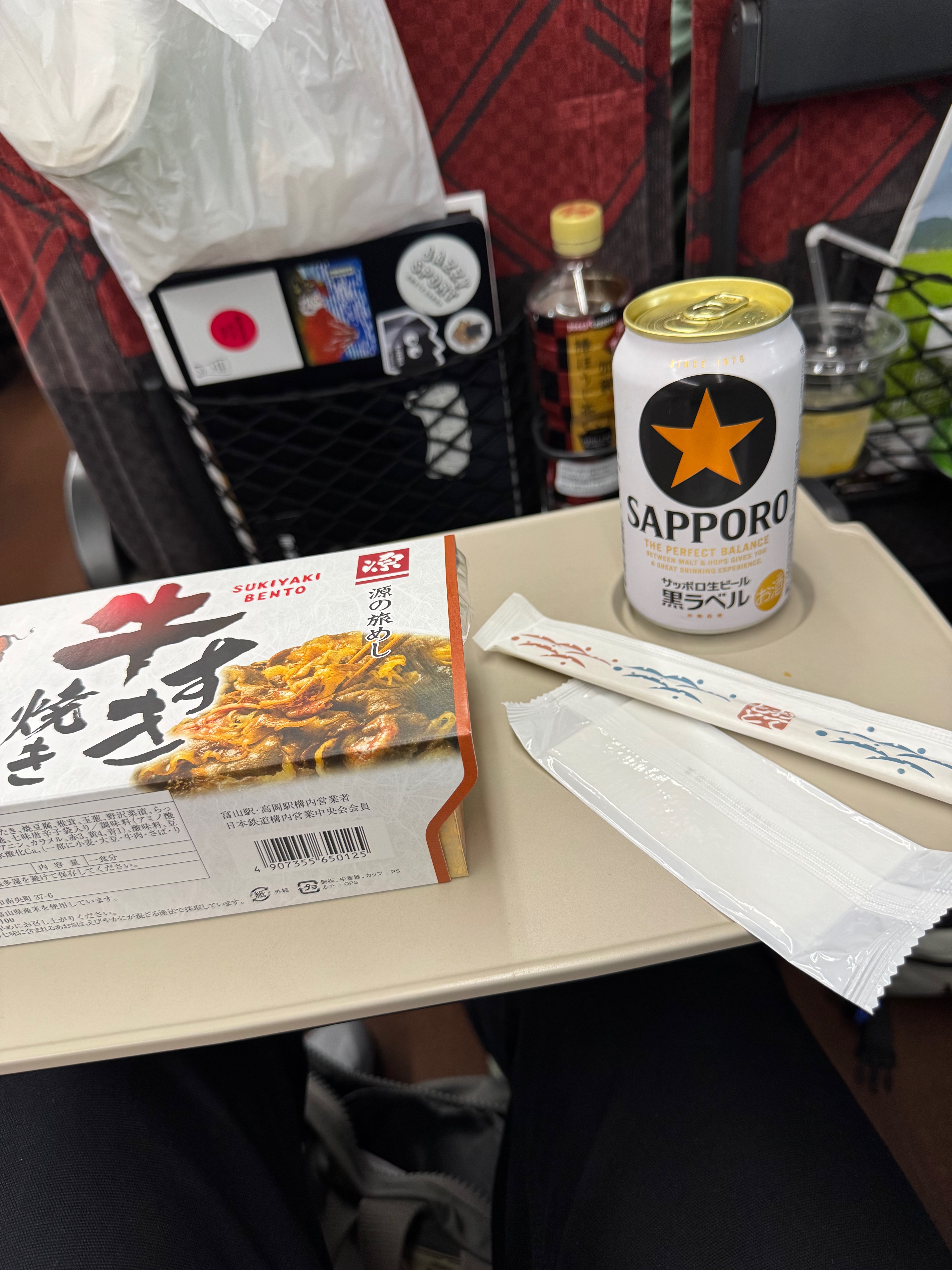 I gambled that there would be a trolley service so I wouldn’t need to drink warm beer, it’s practically required to have a couple on the train. £1.67 for a deliciously cold Sapporo, happy happy.