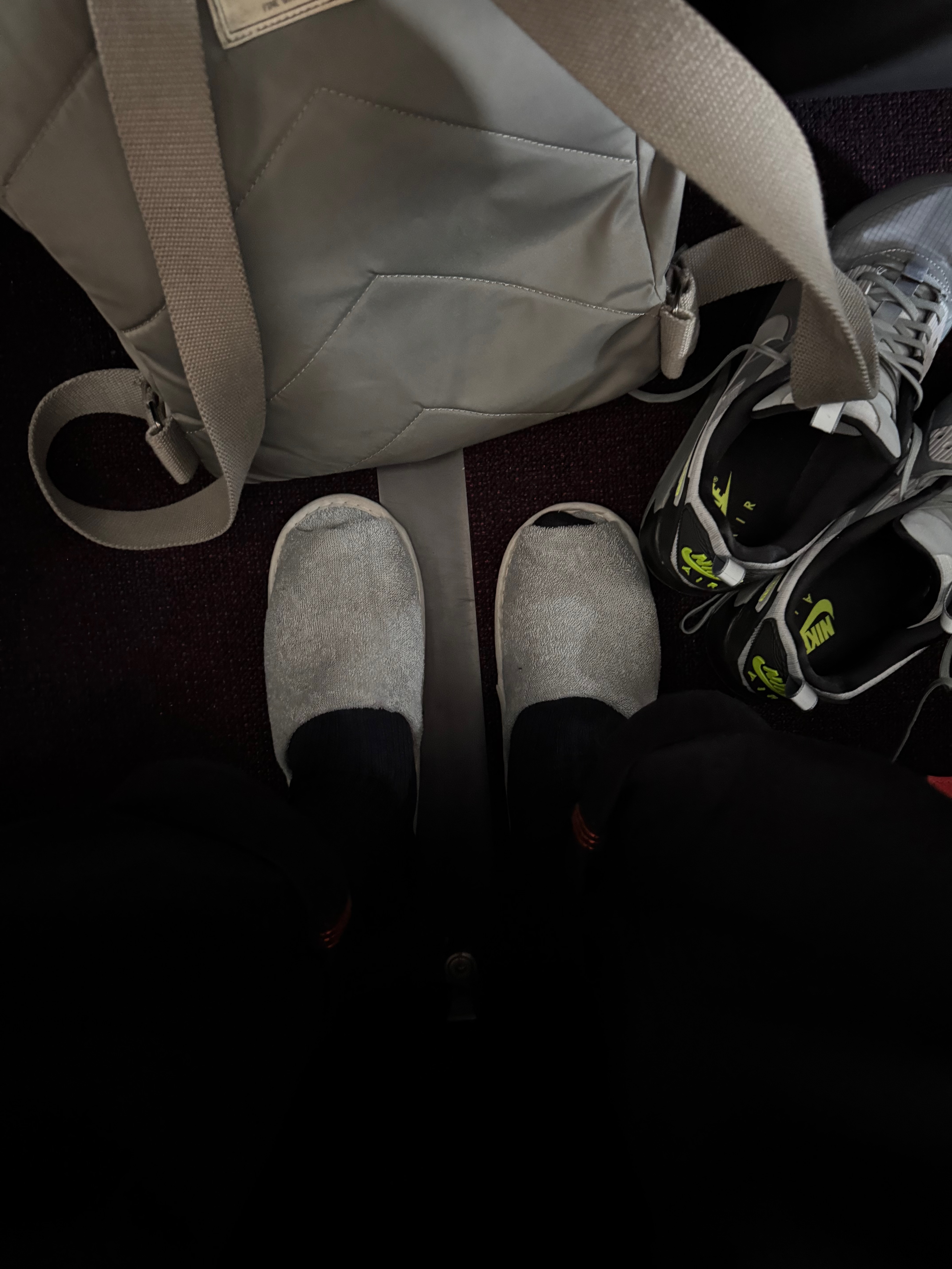 Eventually we’re called back to the desk and yes, they’ve put us together, phew. Some of the pre-flight tension eases and we find our seats and faff around making ourselves comfortable (which includes putting on the provided slippers, a nice touch).