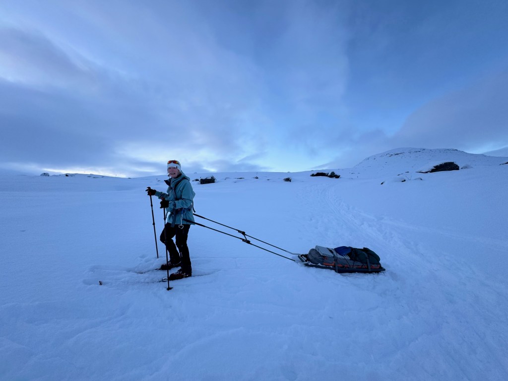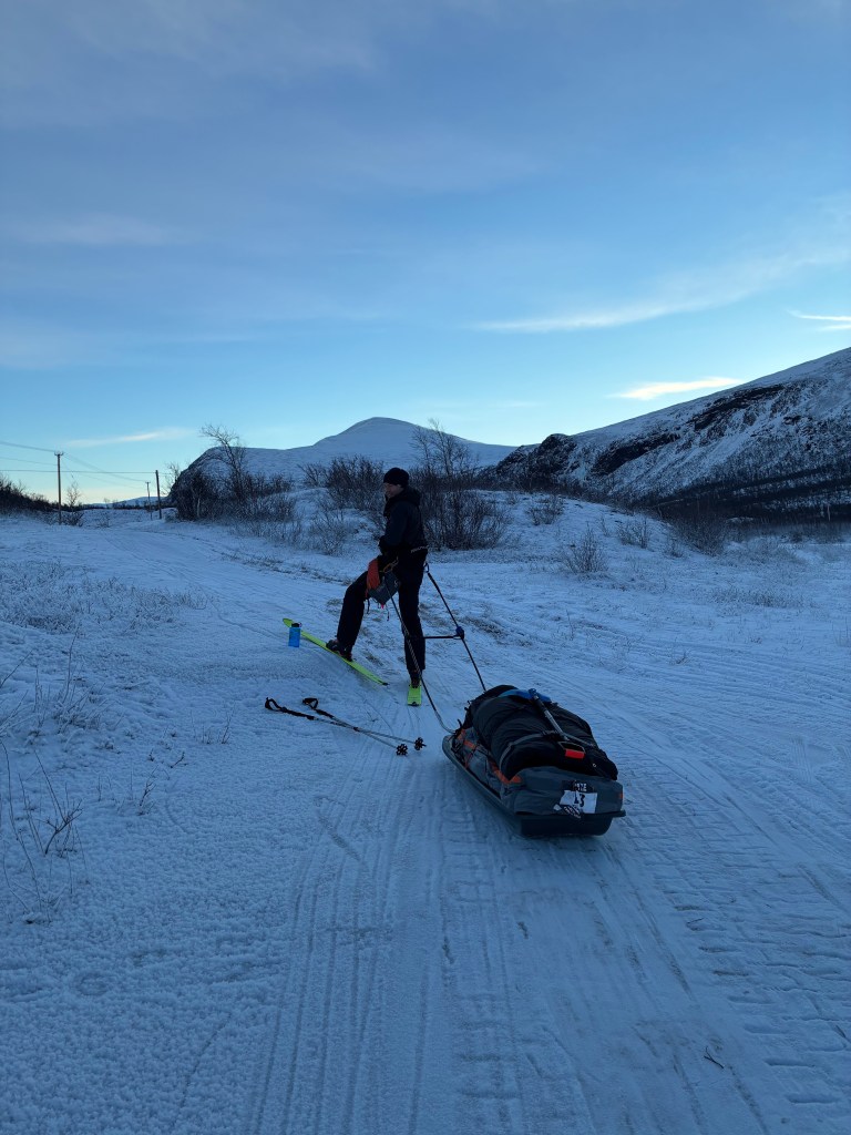 Thankfully I’d packed a random length of sailing rope. I used it to lash the pulk harness where an O‑ring had vanished somewhere in the snow, then tried not to rush the rest of the packing in case I forgot something important. It was fully dark now and the temperature had dropped further, so I added a thick fleece to the three layers I was already wearing, pulled on a heavy buff, and tucked a hot water bottle against my belly under it all.