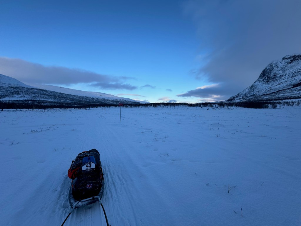 Kirstie’s headtorch had already vanished over a lump in the trail. I set off quickly, not wanting to be left too far behind. My hands had cooled and I was grateful for the extra effort needed to get some warm blood moving. The new gloves I’d bought the day before the start were performing brilliantly so far; my enormous “happy mitts” still hadn’t left the pulk.