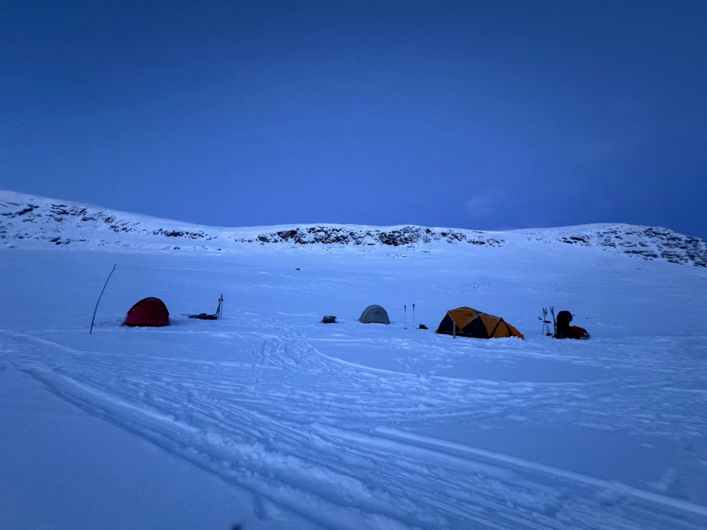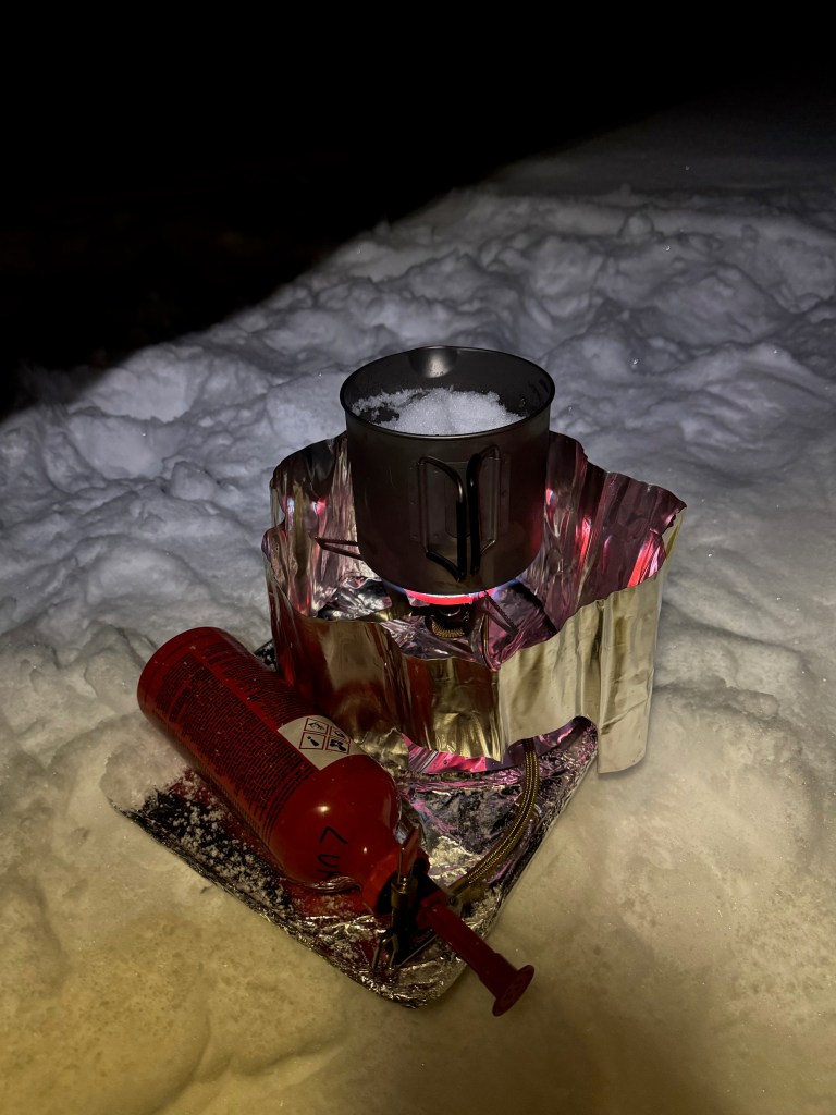 Our second day ended with a mini “exped” (expedition to you and I), pulks fully loaded, to a forest nearby. The goal was to time how long it took to pitch tents and melt snow for a brew. I opted for hot chocolate instead of tea and was pleased how smoothly it all went. Guy lines tied to trees, neat little camp, snow melting away. Sitting in my tent, I wondered if this was the moment to try bringing the stove inside.
