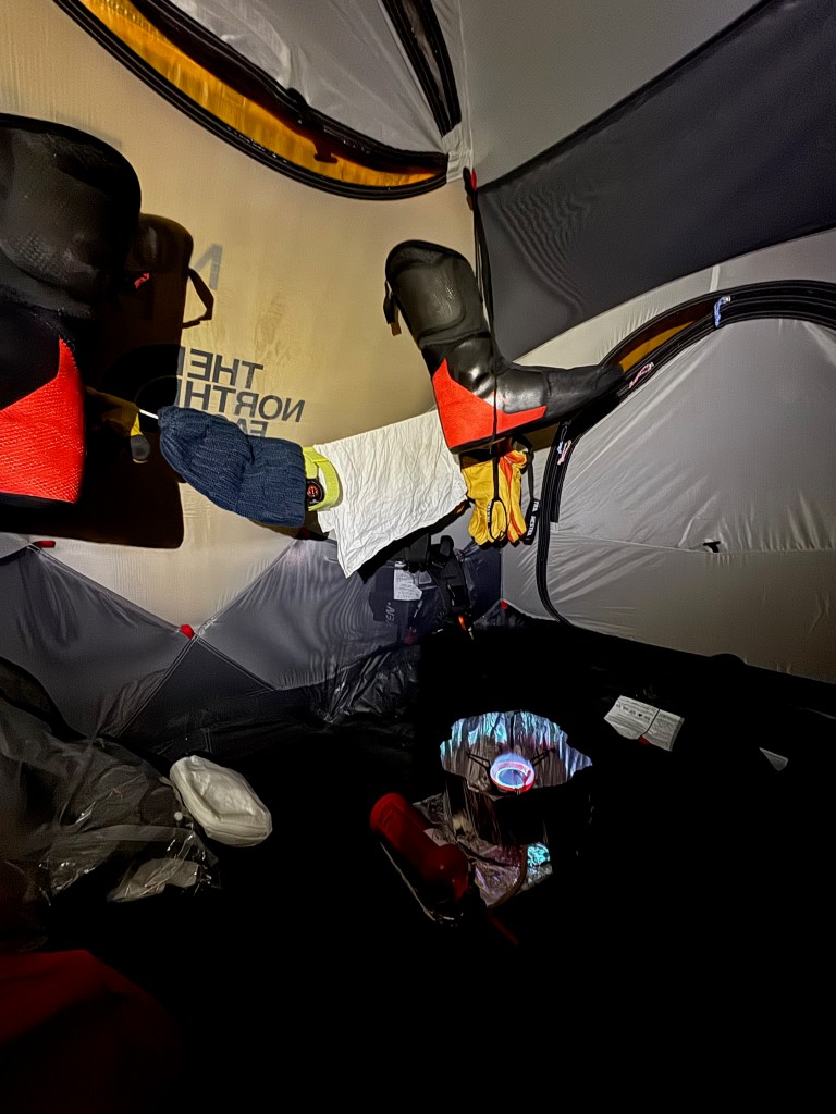 No. It’s an all‑or‑nothing mad dash for safety. If you don’t warm up soon you need to change your base layer. That means putting the tent up, getting the stove going inside, and waiting until you’re warm and dry.