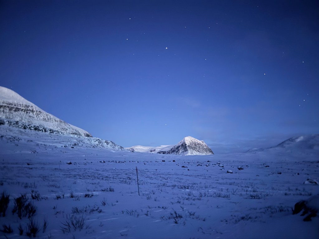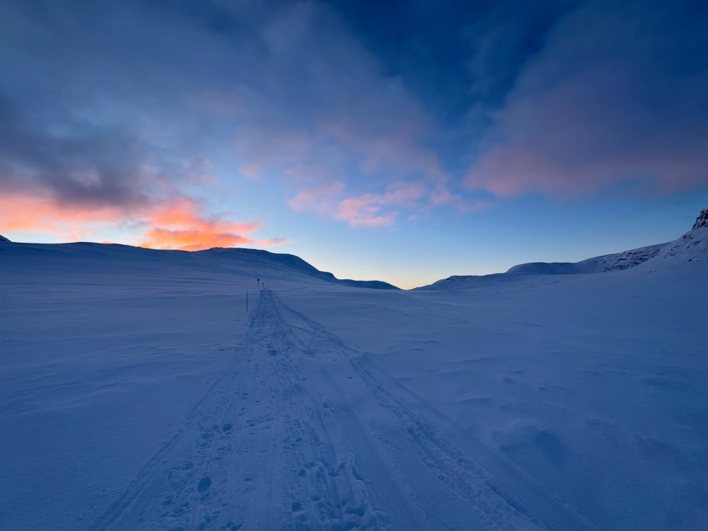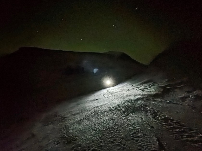 There was no moon and the sky was clear, thousands of bright stars overhead and walls of darkness to both sides. Our headtorches picked out the snowmobile track easily enough, and the slope down the valley was pleasantly gentle. Ten kilometres or so to go.