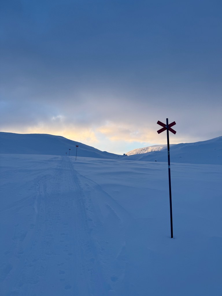 There was a little downhill kink after the hut complex. Four or five people were milling around there and I had to do some clumsy turns to avoid either crashing into them or tipping myself and Killian – I’d named my pulk Killian, hoping that invoking someone more competent than me might make me a little more forgiving of its behaviour.