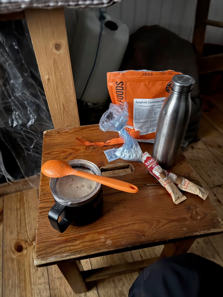 Inside it was draughty. Graffiti scribbled across the walls suggested it was a teenage hangout in the summer. A dead bird lay inexplicably on the floor. The door didn’t shut properly. We wrapped ourselves deep into our big down jackets and fired up the petrol stove. I managed to accidentally open the valve too far, sending a huge yellow flame leaping up. The stove wasn’t actually helping much; it just made us nervous. My flask produced enough warm water for a tepid dehydrated chicken curry – eight hundred calories that barely dented the deficit.
