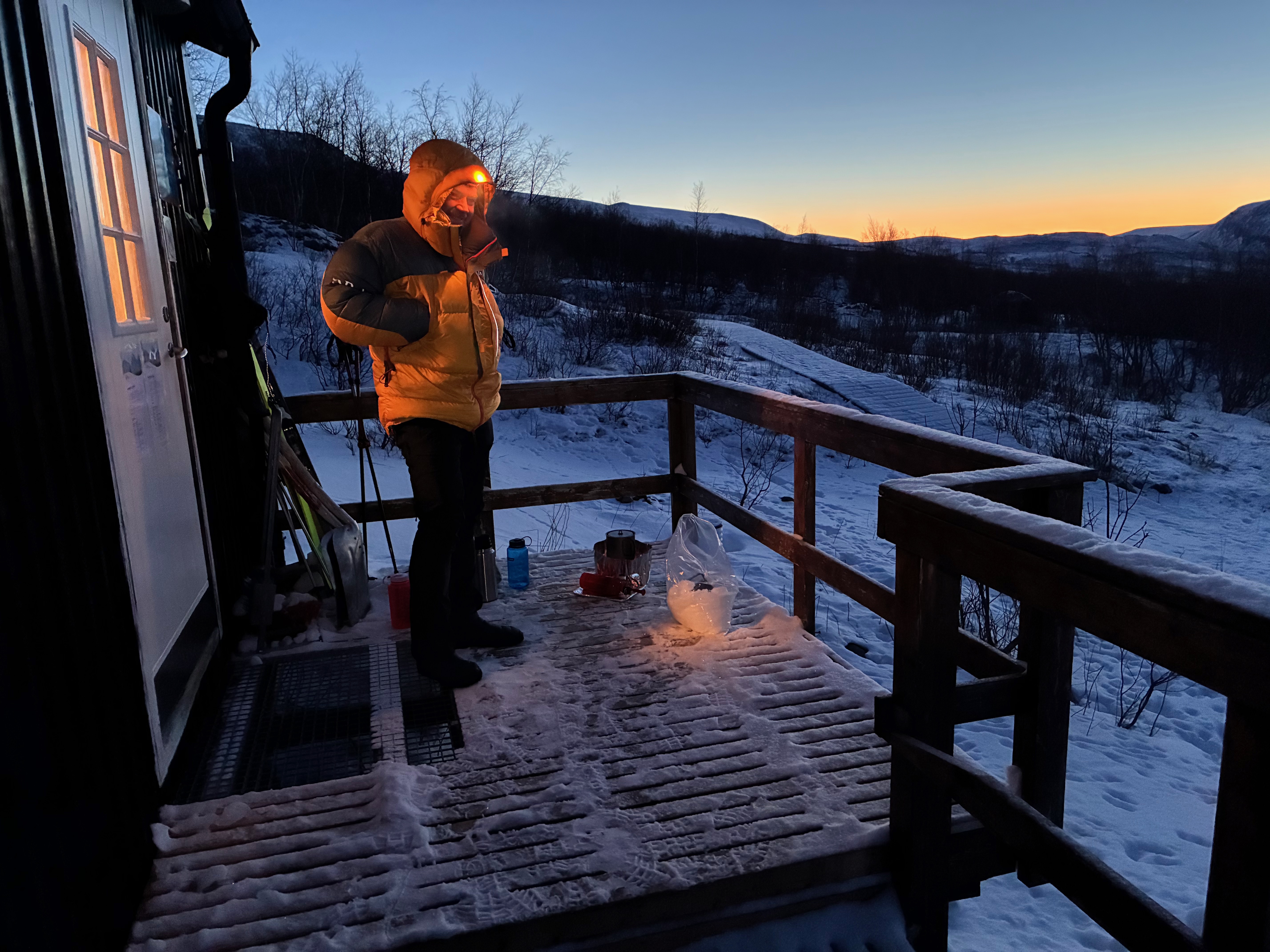 Thankfully I’d packed a random length of sailing rope. I used it to lash the pulk harness where an O‑ring had vanished somewhere in the snow, then tried not to rush the rest of the packing in case I forgot something important. It was fully dark now and the temperature had dropped further, so I added a thick fleece to the three layers I was already wearing, pulled on a heavy buff, and tucked a hot water bottle against my belly under it all.
