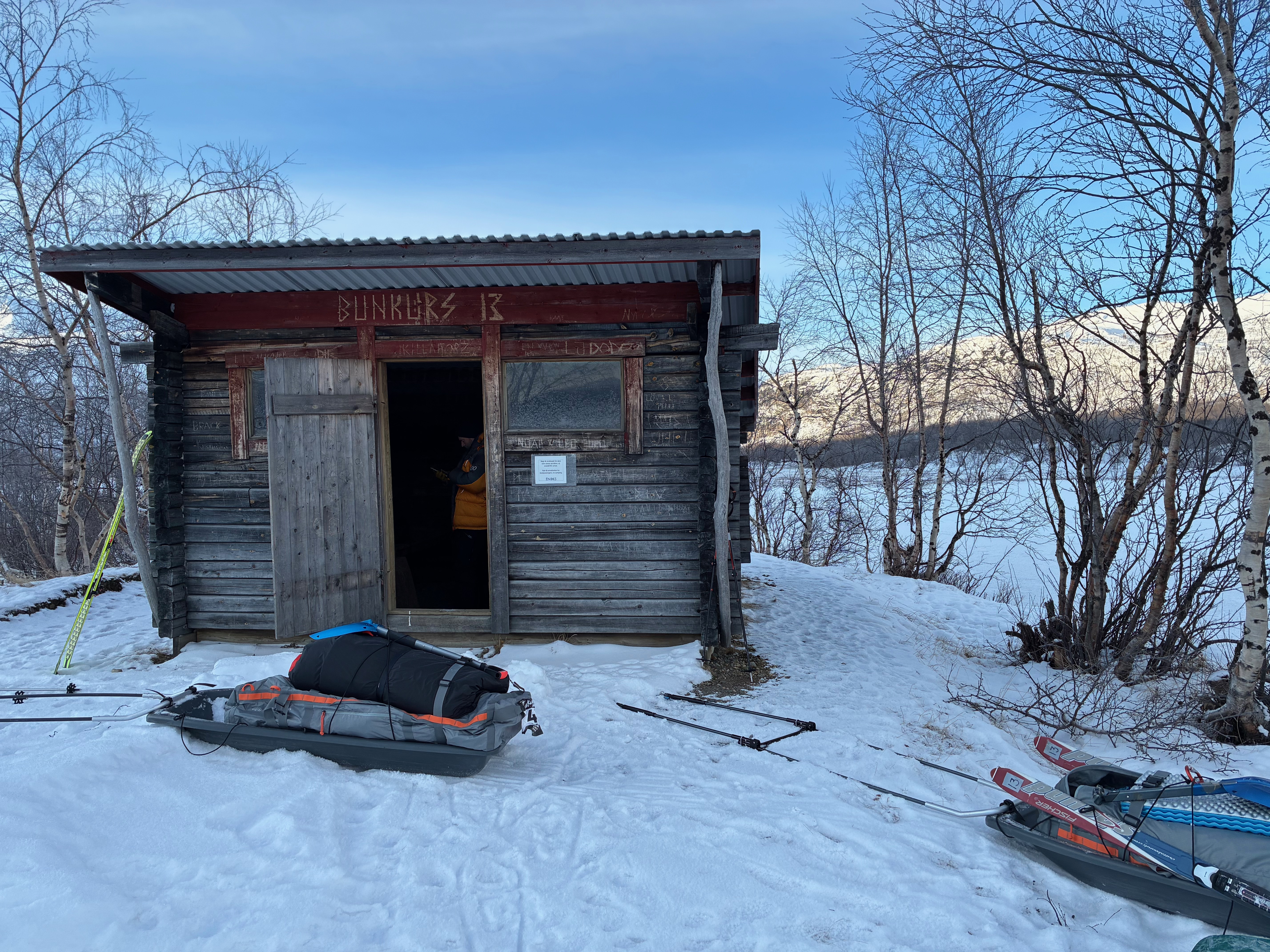 Eventually we reached the cluster of huts we’d been aiming for. From a distance they looked like a small village: maybe ten buildings of different shapes and sizes, half buried in snow. We parked our pulks and pulled on down jackets.