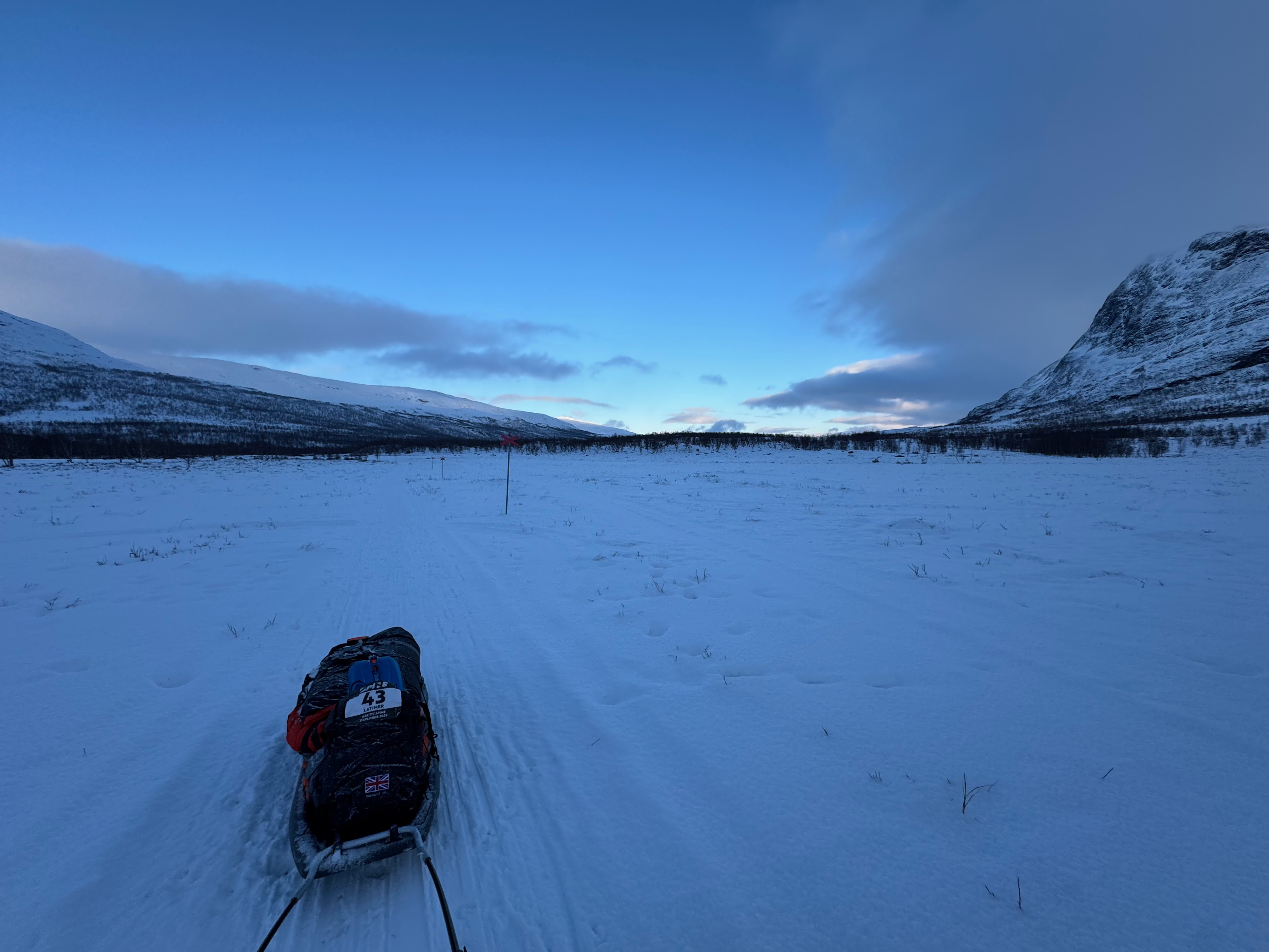 There was a little downhill kink after the hut complex. Four or five people were milling around there and I had to do some clumsy turns to avoid either crashing into them or tipping myself and Killian – I’d named my pulk Killian, hoping that invoking someone more competent than me might make me a little more forgiving of its behaviour.