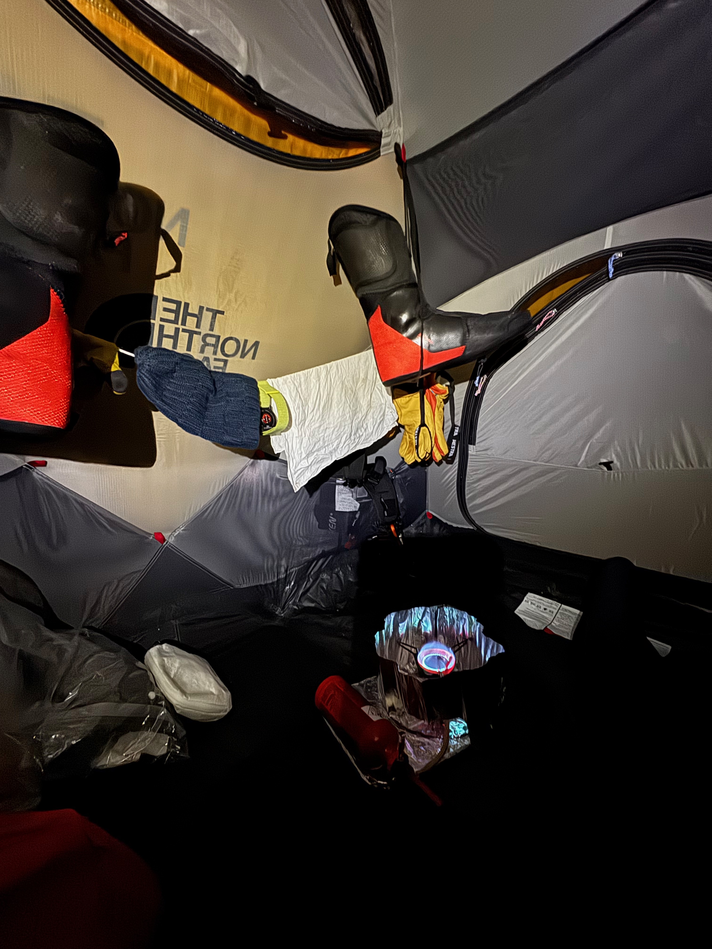 No. It’s an all‑or‑nothing mad dash for safety. If you don’t warm up soon you need to change your base layer. That means putting the tent up, getting the stove going inside, and waiting until you’re warm and dry.