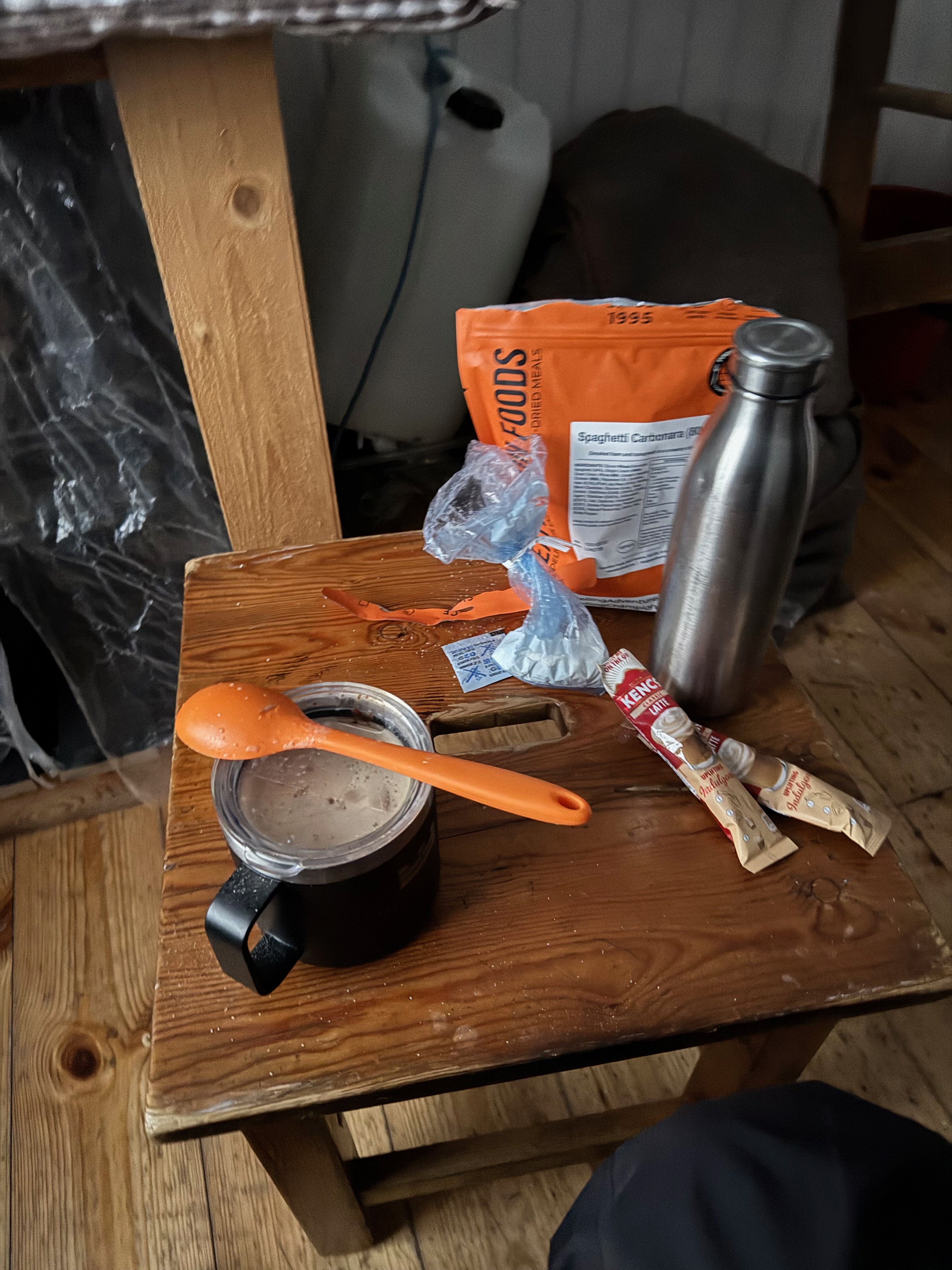 Inside it was draughty. Graffiti scribbled across the walls suggested it was a teenage hangout in the summer. A dead bird lay inexplicably on the floor. The door didn’t shut properly. We wrapped ourselves deep into our big down jackets and fired up the petrol stove. I managed to accidentally open the valve too far, sending a huge yellow flame leaping up. The stove wasn’t actually helping much; it just made us nervous. My flask produced enough warm water for a tepid dehydrated chicken curry – eight hundred calories that barely dented the deficit.