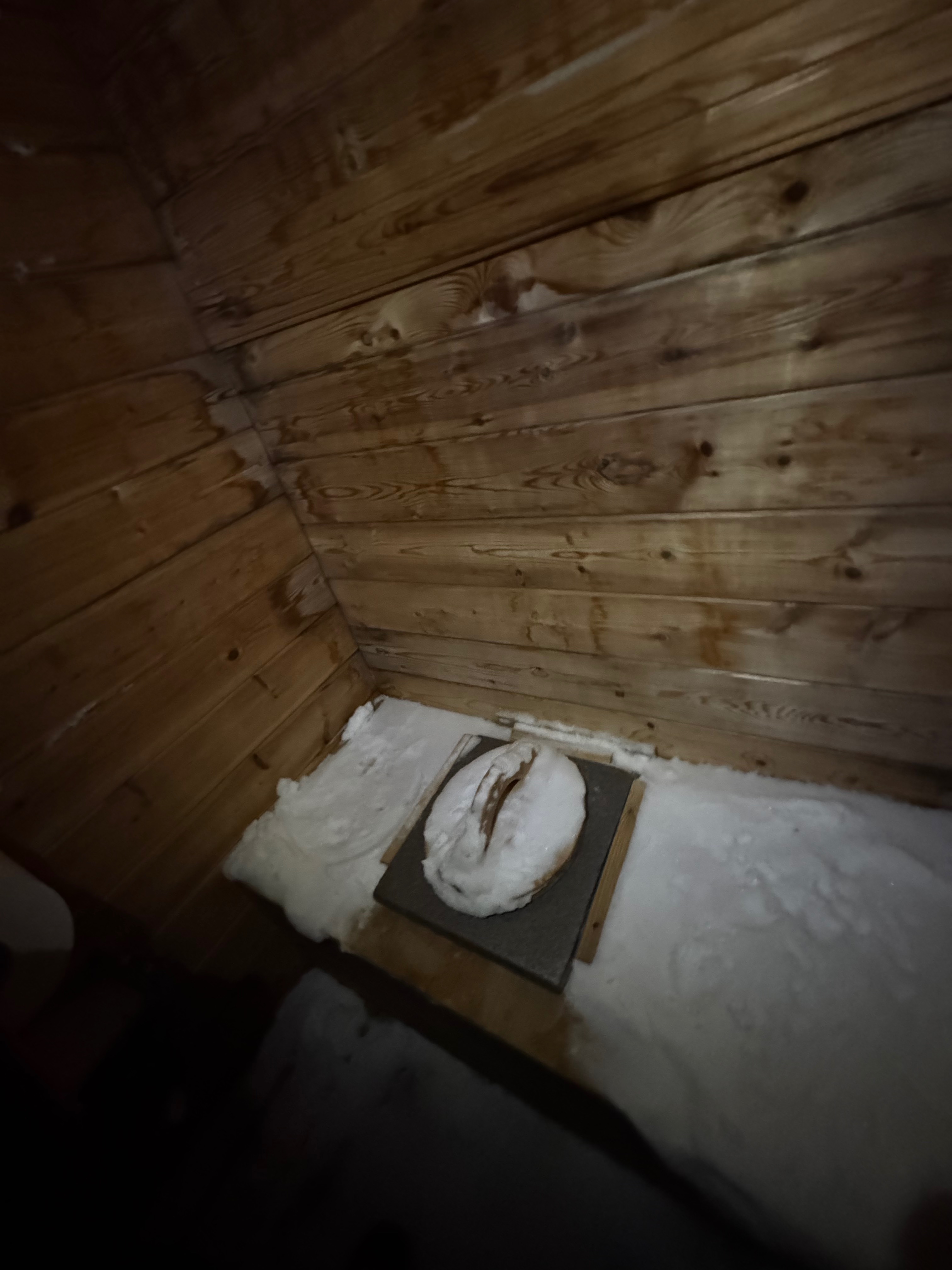 Minutes earlier we’d been in high spirits, joking about frostbite and sunbathing. Now the reality of -30 °C hit. At these temperatures, the second you stop generating heat, the air and wind strip away what little you have. Even a minute without big gloves can push fingers into the danger zone. We’d had ours off for too long, lulled into a sense of safety by four flimsy wooden walls.