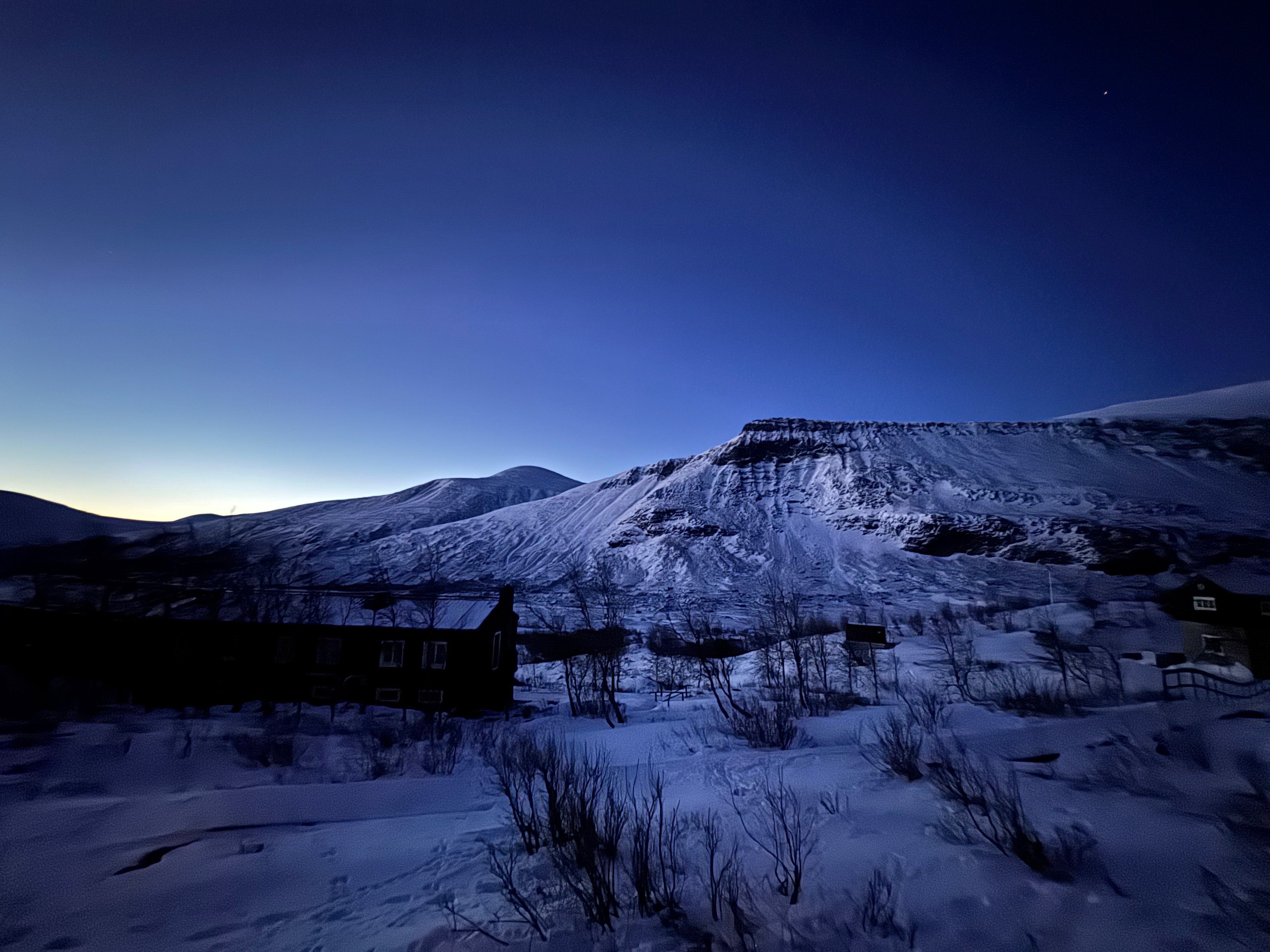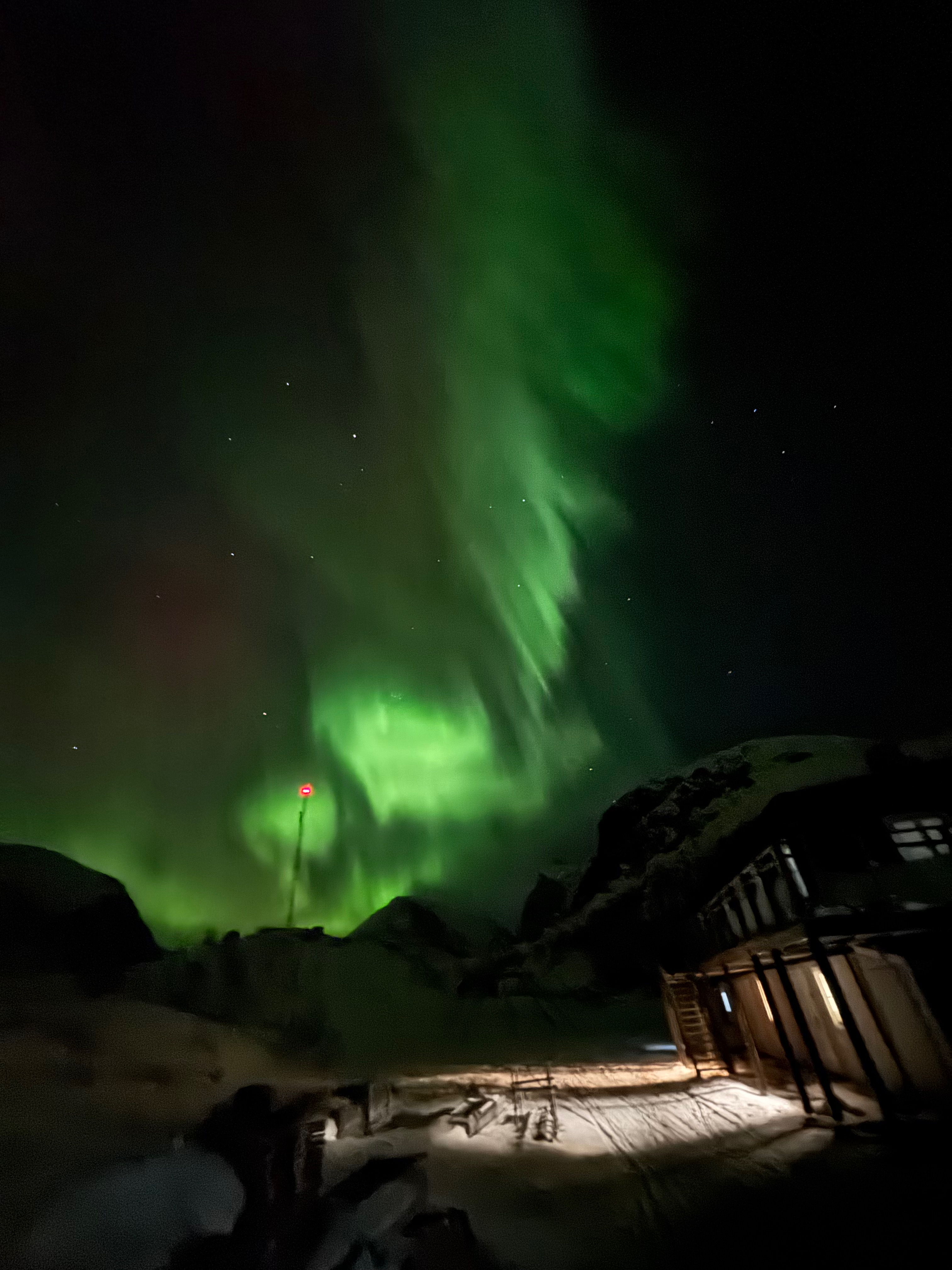 We decided to skip hot water bottles and stepped outside to brush our teeth. The sky was clear. Black mountains ringed us on all sides, bright stars scattered above. Then a green cloud drifted into view, slowly twisting and unfurling across two thirds of the sky. The best northern lights we’d seen yet, and because our eyes were fully dark adapted it looked just like it does on camera. A genuine treat.